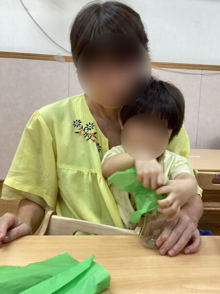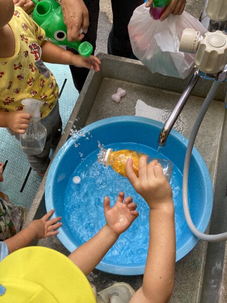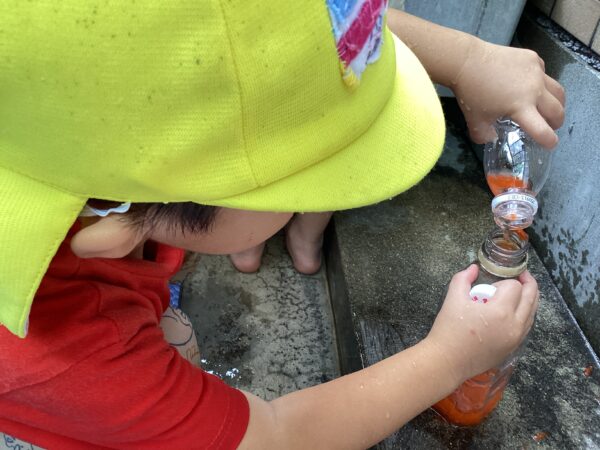 保育園では身近なお花紙を使い、色水作りをしました。まずはお花紙を小さなペットボトル容器に詰め、水を入れてよく振ります。コップや容器に水を移すと、いろいろな色水のできあがり。色を混ぜ合わせたり、同じ色に何度も水を入れて色の濃さの変化を確かめたり、子どもの探求は尽きることがありません。またお花紙が溶けて細かくなるのを見て「苺みたい」と果物に例えフルーツジュースを作り大盛り上がりでしたよ。今度はそのジュースを使いお店屋さんに発展できたらいいなと思います。