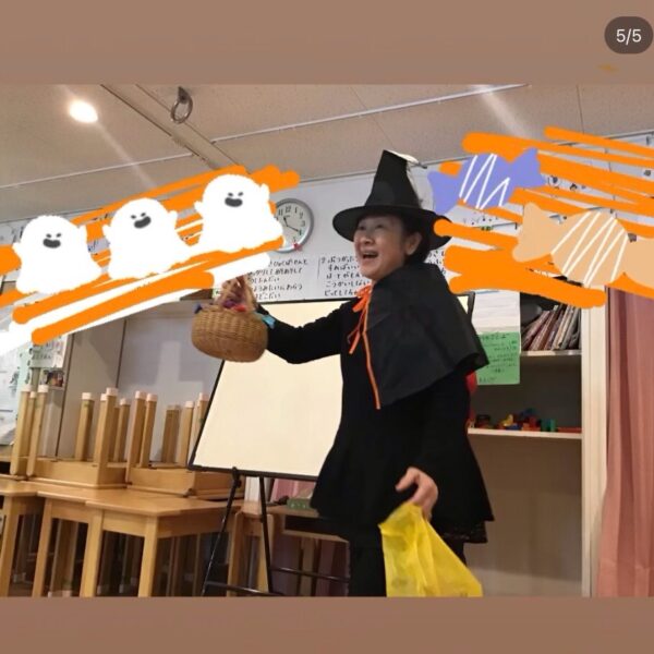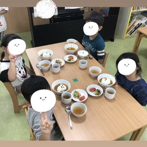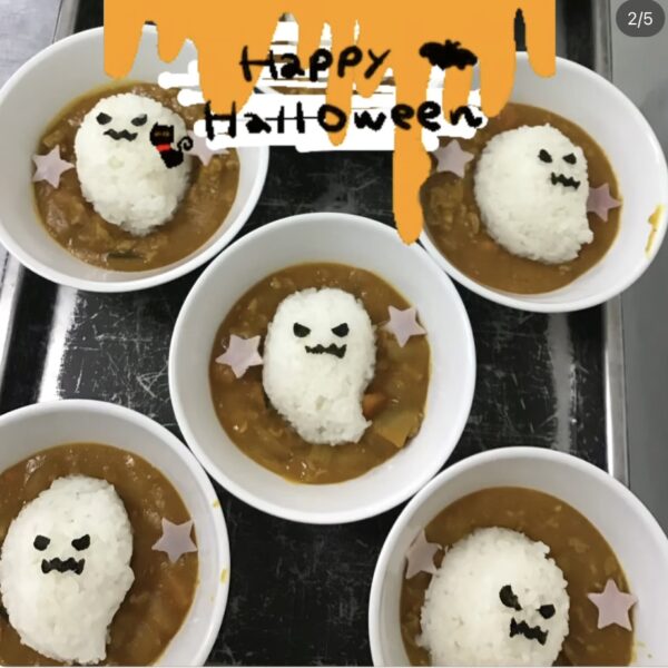 こんにちは。りんごっこ保育園本園です。.ハロウィンの日はハロウィンにちなんだ給食メニューとなりました。.オバケのカレーに大興奮の子ども達でした!.活動の時間には園長先生が魔女になって折り紙で作ったキャンディーをプレゼントしてくれました。