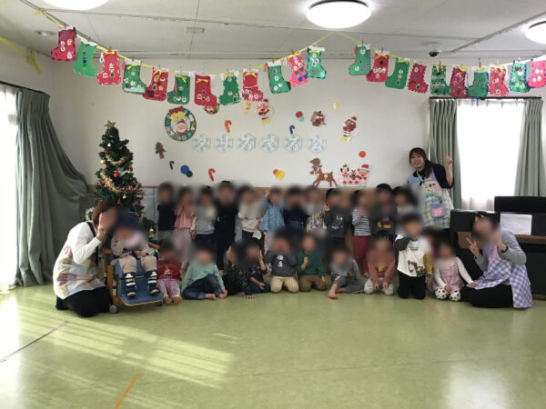 こんにちは。りんごっこ保育園本園です。.12月にクリスマス会がありました。幼児組では3歳児ぱんだ組、4歳児きりん組、5歳児ぞう組による歌や合奏の発表が見られました。.また、保育者による「大きなカブ」の劇では「うんとこしょ、どっこいしょ」ととても盛り上がっていました。