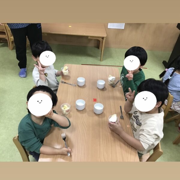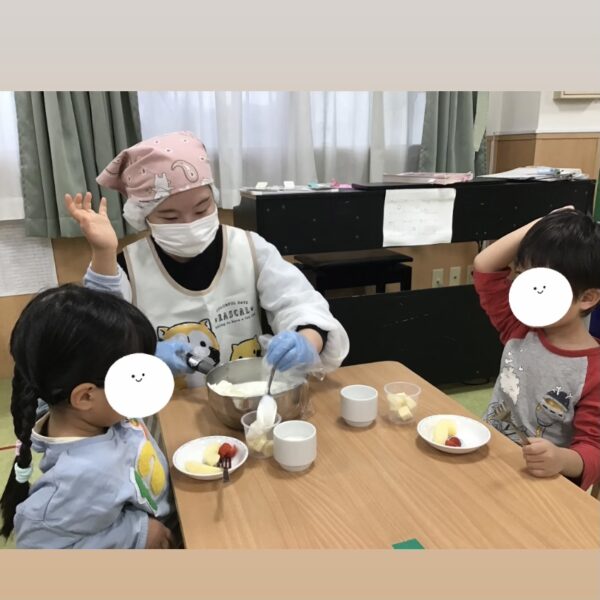 こんにちは。りんごっこ保育園本園です。.クリスマスにトライフル調理保育がありました。トライフルとはイギリスのデザートで、クリームやスポンジケーキ、フルーツなどを器のなかで層状に重ねたものという意味となります。.「美味しそうなパフェが出来た!」と嬉しそうな子ども達でした。