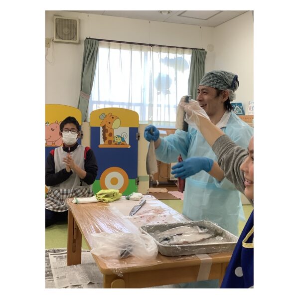みんなでお祝いした後は給食の先生によるサバの解体ショーのプレゼント🎁