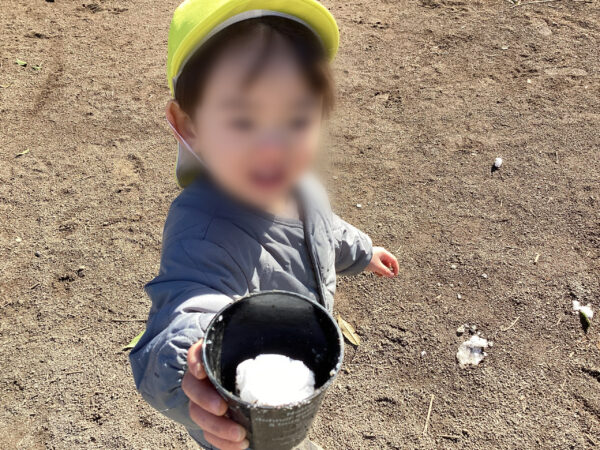 りんごっこ保育園本園うさぎ組です。先日積もるほどの雪が降ったので、雪遊びを楽しみました。しゃりしゃりの感触を踏んで楽しんだり、触って「冷たーい!」とお友だちと顔を見合わせて大興奮の様子でした☺︎