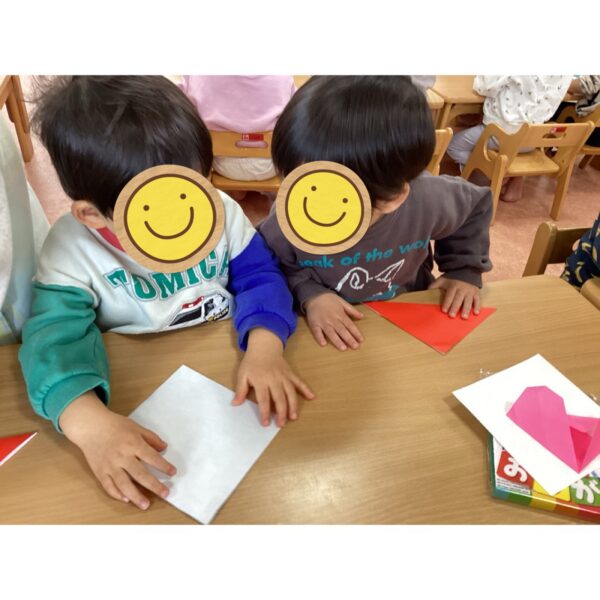 2月の製作ではバレンタインでハートを、ひなまつり製作ではお内裏様とお雛様の洋服を折りました。