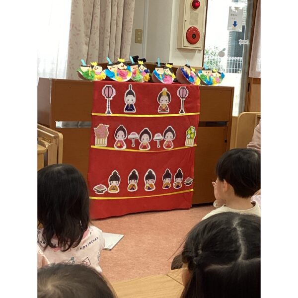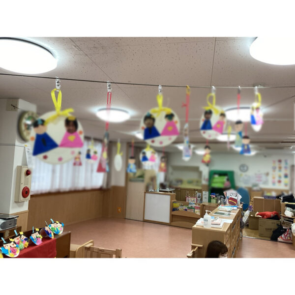 3月3日はひな祭り、乳児フロアにはみんなが作った製作を飾ってひな祭りのお話をしたり、ひな祭りにちなんだクイズや宝探しを楽しみました。