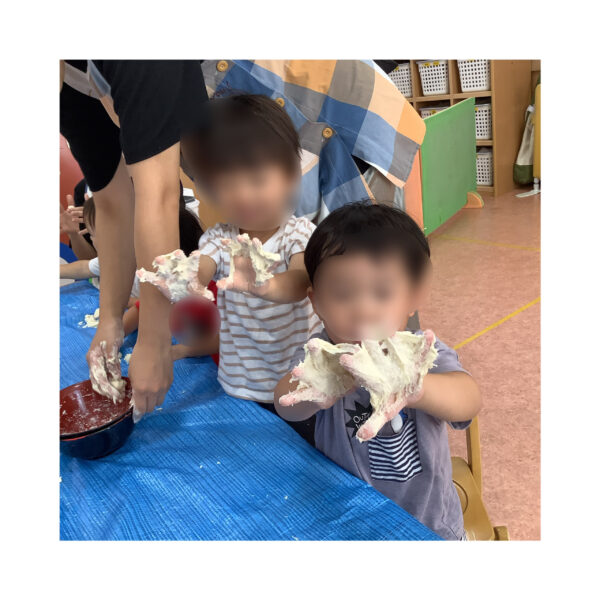 小麦粘土ではつんつんと慎重に触ってみたり、びよーんと伸びた様子を「みてみてー!」と嬉しそうに教えてくれ楽しんでいました。